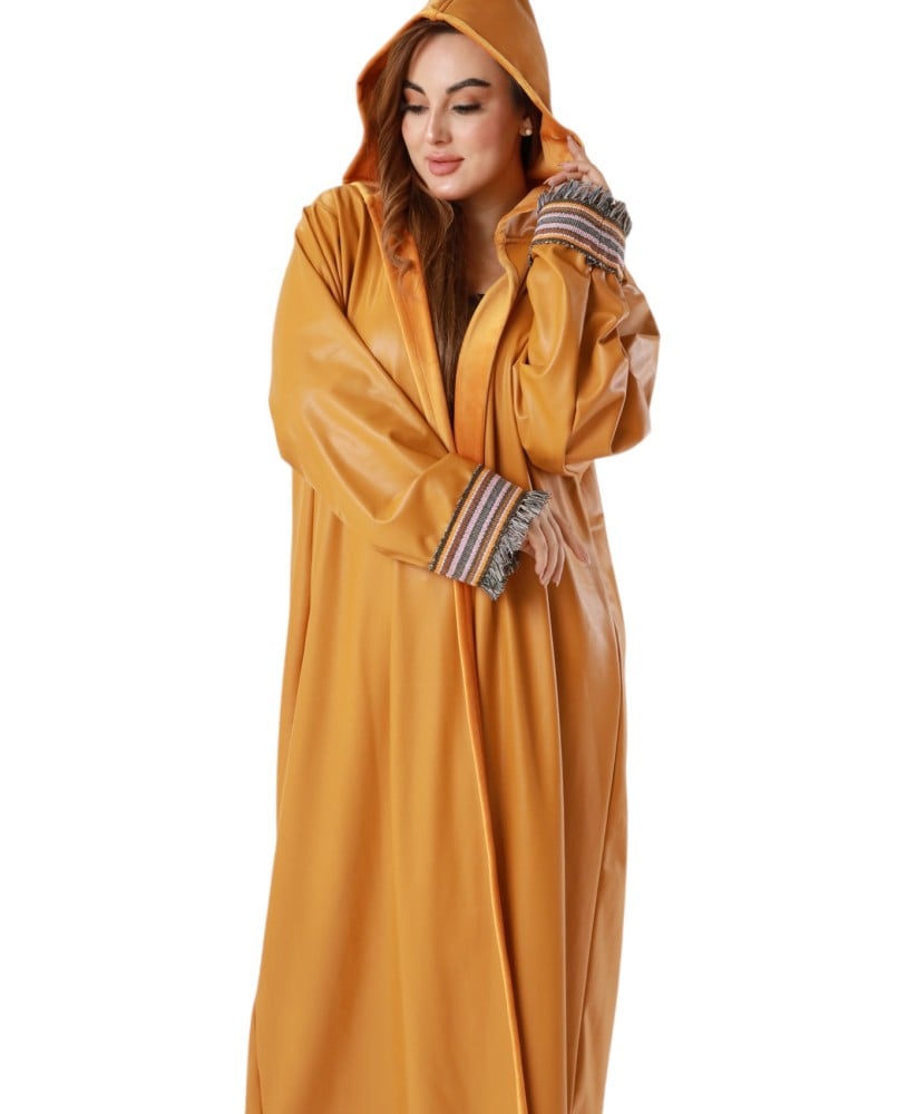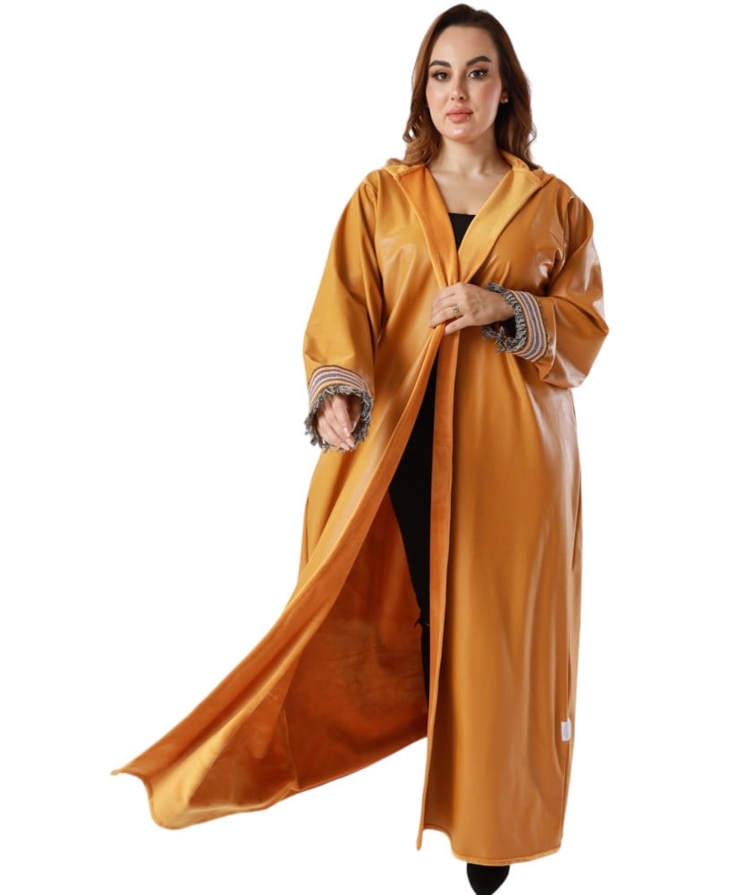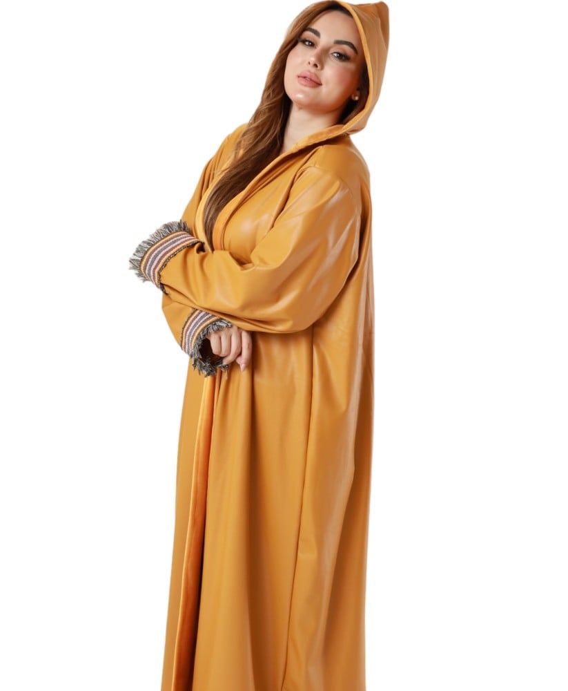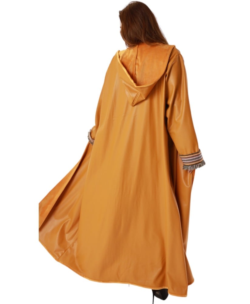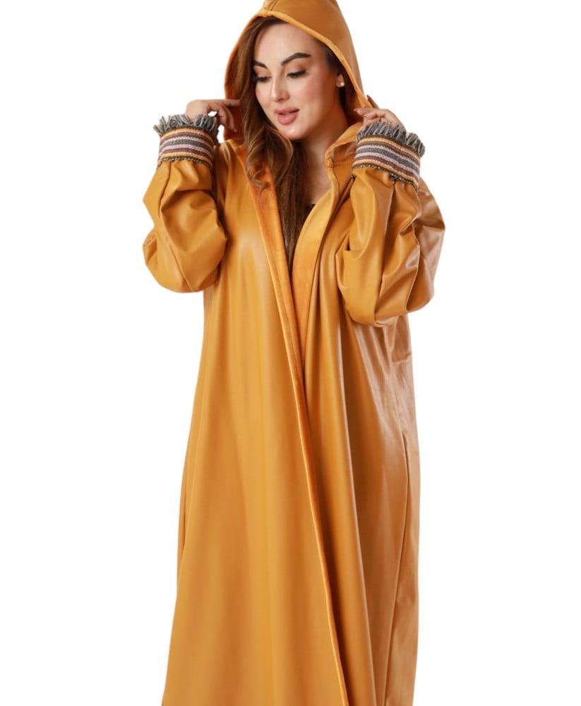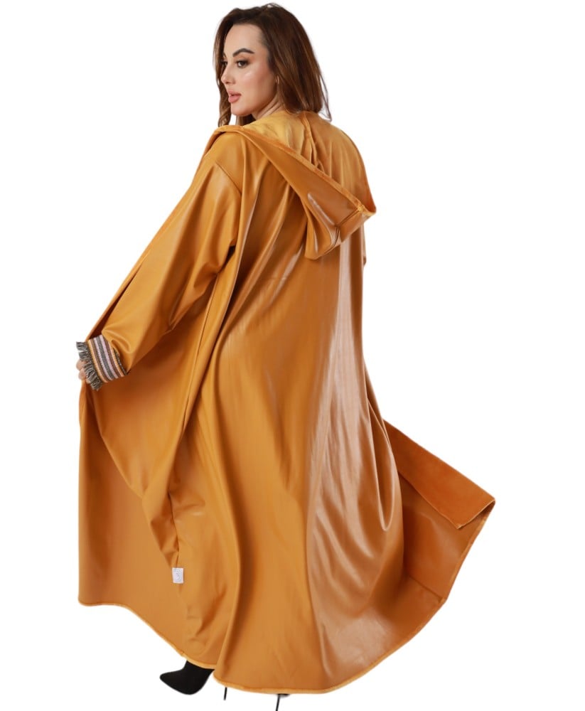 عباية من الجلد مبطنه بفرو ناعم مع هودي، صممت بطريقة عصرية لتعطيكي مظهر شتوي متميز